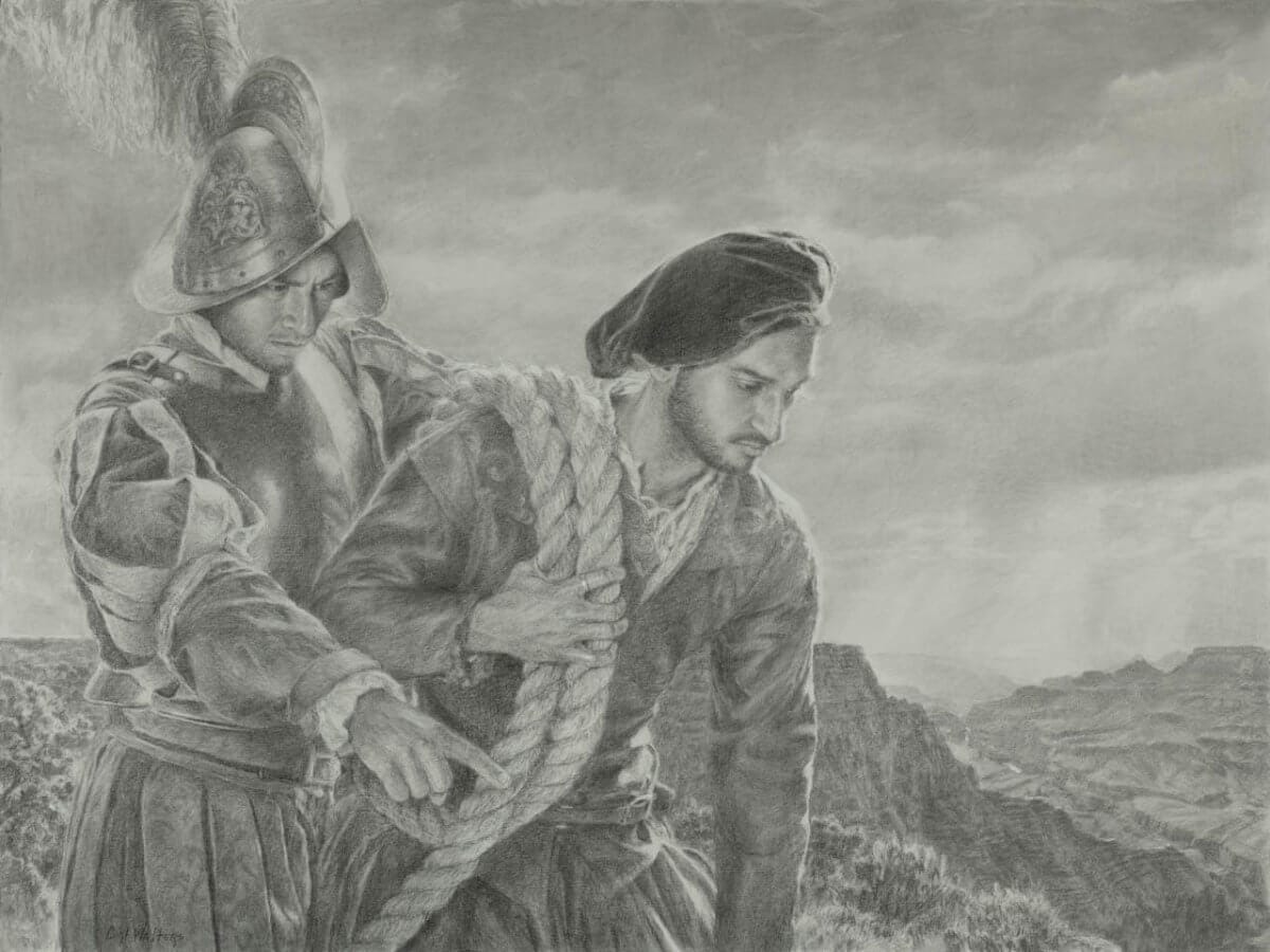 In his charcoal drawing CAPTAIN PABLO DE MELGOSA AND JUAN GALERAS: PLANNING DESCENT- GRAND CANYON 1540, Curt drew his models standing at the edge overlooking Grand Canyon near Lipan Point. Captain Melgosa is wearing a Morion style helmet and breast plate and Jaun Galeras has a rope over his shoulder anticipating a difficult route to the river.
