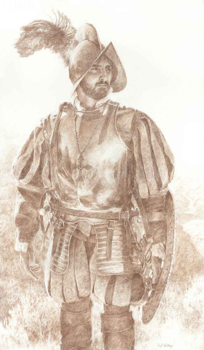 It is the first moments of being confronted by the massive chasm that I have chosen to draw in “Garcia Lopez de Cardenas: September 1540”. In my research I have found that Lopez de Cardenas was first cousin to Coronado and distant cousin of Carlos V King of Spain, so there is a clue to his physical appearance. I discovered my model three years ago, a friend of my grandson. Ty Brand is a very handsome young man from the Cottonwood, AZ area. Immediately upon meeting him, he made me think of Lopez de Cardenas. His dark piercing eyes and facial features are perfect as the face of Cardenas. In my portrait of Lopez de Cardenas, he looks into the distance as he stands at the edge of Grand Canyon, behind him is the Colorado River.