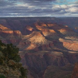Submitted to this year’s show is the breathtaking “Perchance for Eons“, an 18″ x 18” view of the Grand Canyon. The Grand Canyon, perchance for eons in creation, is the widest and deepest of its kind. “It has never disappointed me,” Curt said, continuing with “Every visit and every painting has its own unique story.” In this painting the erosion of an early November rain intensifies the color, all richly dark and wet. Cheops Temple and the Buddha Complex glisten in a moment of late evening light.