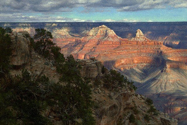 The area around this foreground formation near Maricopa Point is now closed to tourist so the National Park Service can reestablish the natural growth worn down over the years. I asked Ranger Scott to accompany me while I carefully painted at this point once again, much like visiting an old friend.