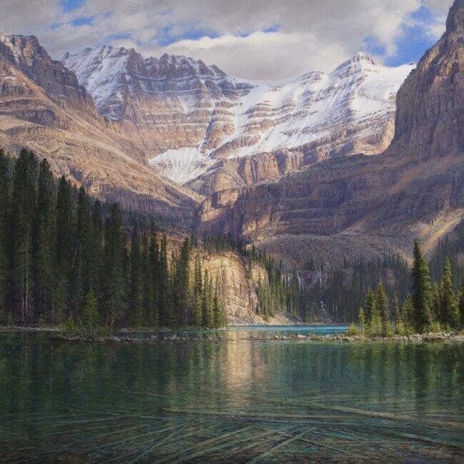 Canada’s Lake O’Hara, in Yoho National Park, is one of the most beautiful places I’ve ever painted. The amazing Lefroy glacier, a sparkling sheet of ice, forms the Seven Sisters Falls which cascade into the emerald green lake below. The deep water is full of centuries of fallen pines which add to the wildness of the place.